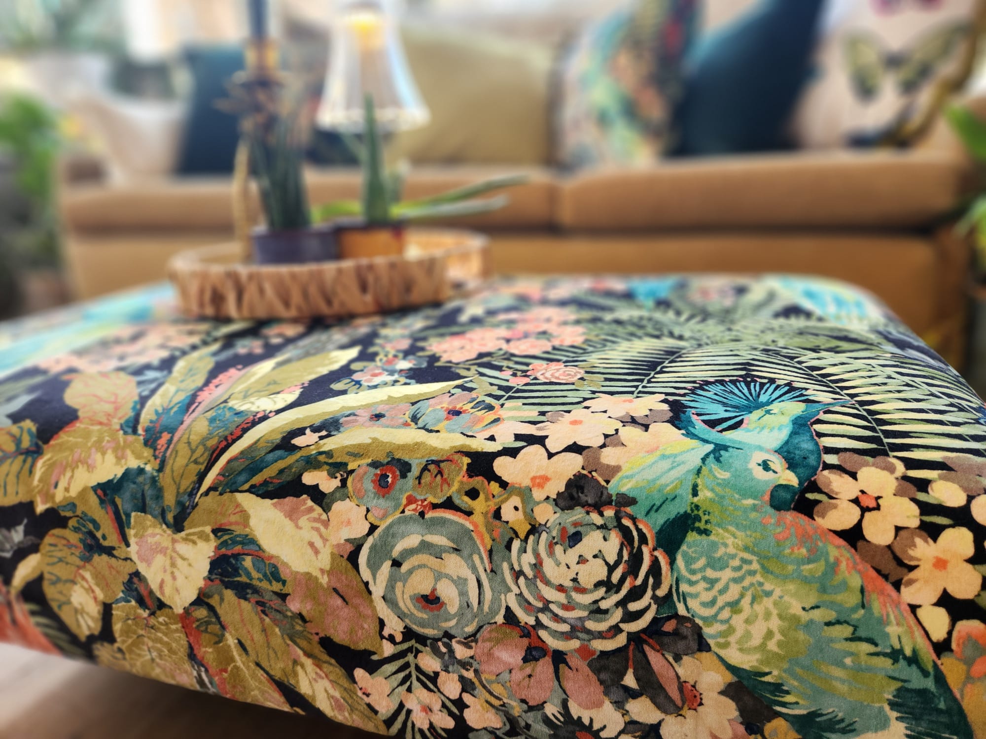 A beautiful handmade upholstered Coffee Table, Large Footstool, in Linwood Rainforest Rabble Velvet.