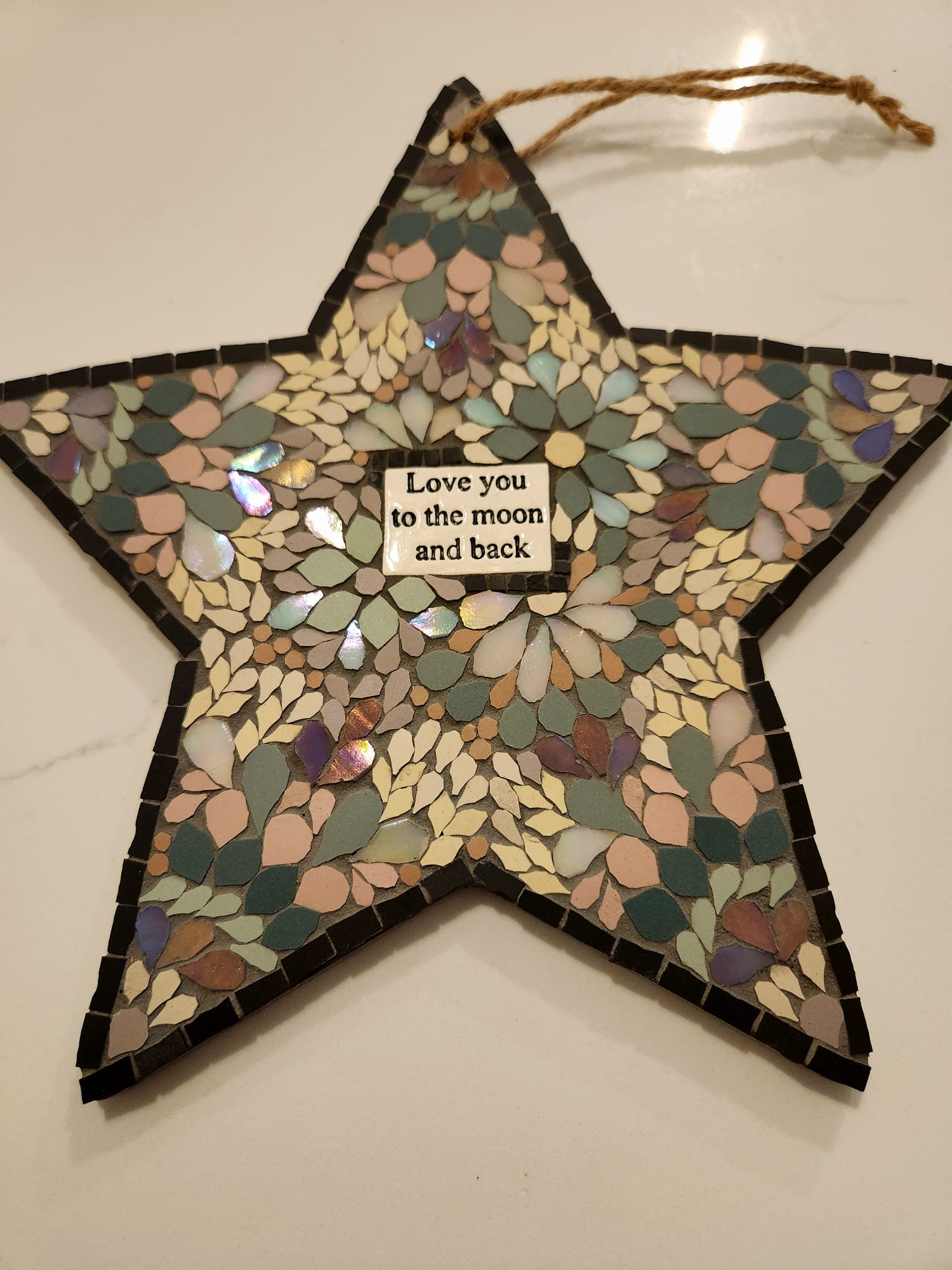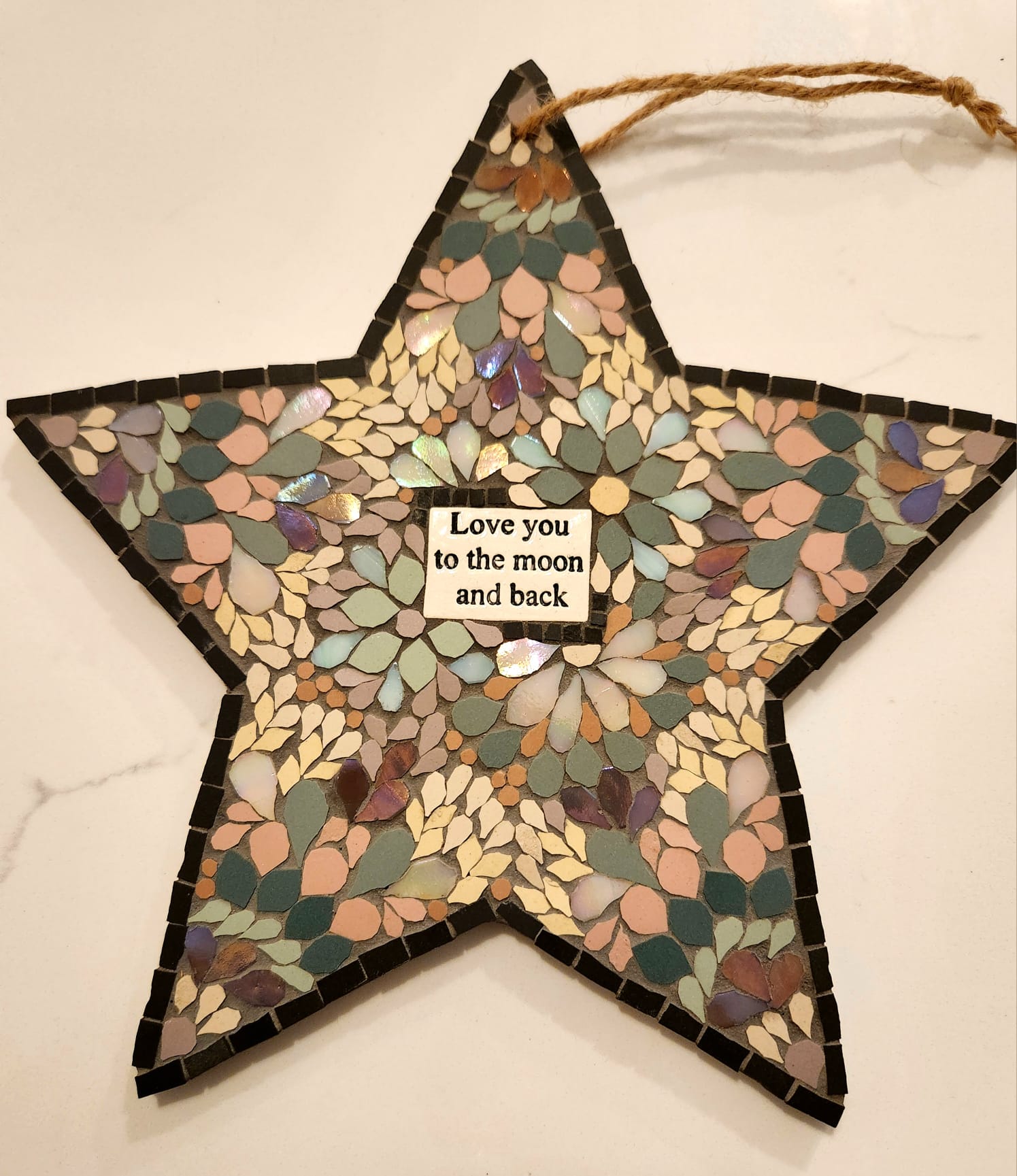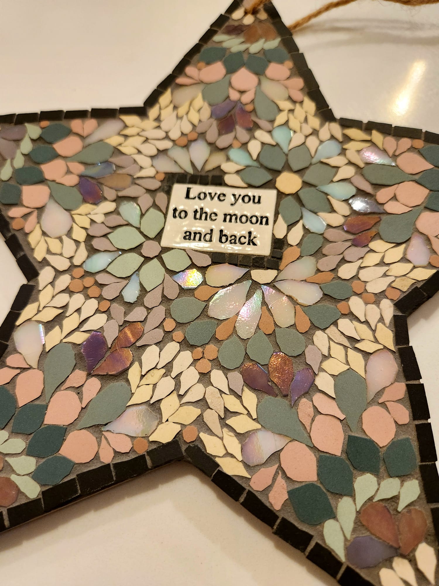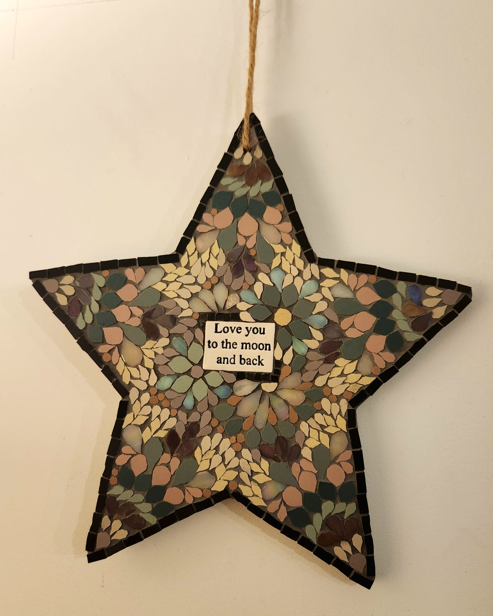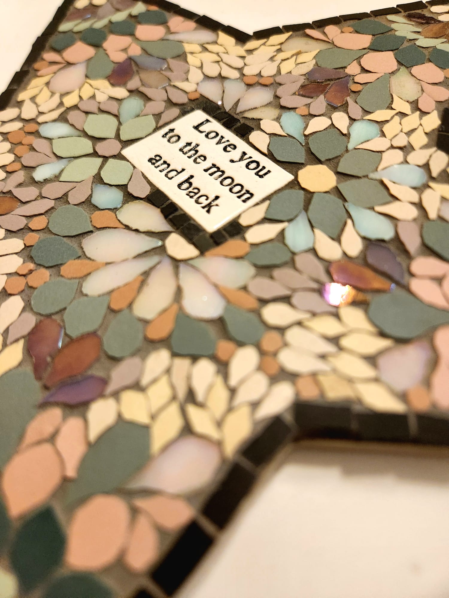 A beautiful handmade mosaic star, featuring the heartfelt message “Love you to the moon and back” – the perfect keepsake for someone truly special.